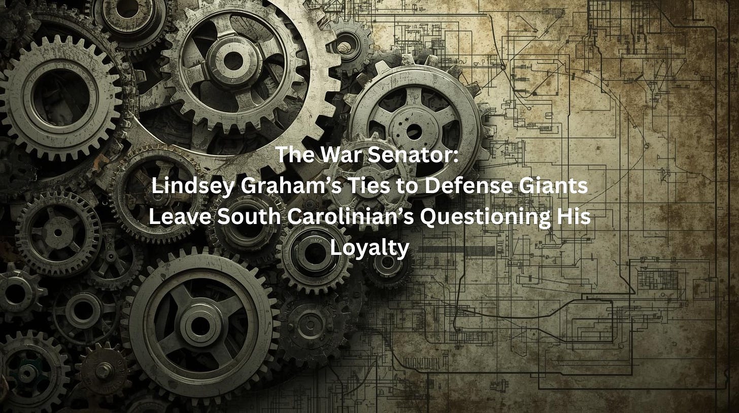 By The South Carolina Bulletin Investigations DeskIn diners across Columbia and gas stations off I‑95, the same sentiment keeps surfacing: Lindsey Graham’s not working for us anymore. The senior senator from South Carolina has become one of Washington’s loudest voices calling for endless funding to fuel the war in Ukraine, even as his own state’s bridges crumble, hospitals close, and small businesses drown in red tape. Graham calls it “an investment in democracy.” But to growing numbers of South Carolinian’s, it looks like a profit-sharing scheme between Congress and the military industrial complex. Decades into his Senate career, Graham’s donor network reads like a directory of the Pentagon’s favorite contractors. Lockheed Martin: major donor through employee PACs operates fighter jet retrofit programs in Greenville. https://samueleburns.substack.com/p/the-war-senator-lindsey-grahams-ties |